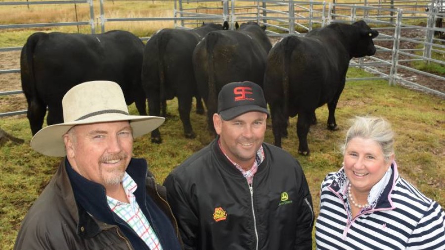 Despite the terrible weather forecast a crowd of 100 braved the rain the to attend the 2016 Alumy Creek Angus Bull Sale. A good mix of repeat and new buyers locally and across a very wide area supported the sale. 35/ 39 Bulls offered sold on the day, for an average of $5300, up $1000 on last year and a top price of $9000 on 3 occasions. Elliot McKinnon, Lyncote, Hunter Valley purchased two of the top priced $9000 bulls, Lots 3 Alumy Creek Upshot K81 and Lot 5 Alumy Creek Upshot K39, as well as Lot 9 Alumy Creek Earnan K49 for $6000 and Lot 10 Alumy Creek Upshot K55 for $7000. He said he was chasing quality genetics with the potential to command premium prices from the market. Last year he said he was payinfg more for similar quality to the bulls he was able to obtain for very affordable prices in Tenterfield.